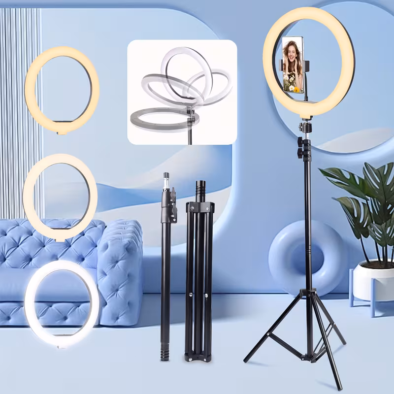 Set lampă rotundă si trepied pentru poze, reglabilă, suport pentru telefon, cu LED-uri, Telecomanda Selfie inclusă